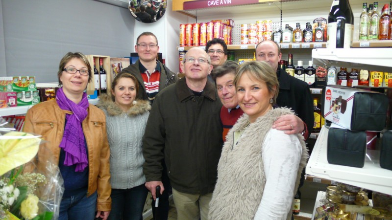 Carole Simon, au premier plan, entourée de membres de l’association des commerçants et artisans de Pré-en-Pail, de Michel Courtin, ancien propriétaire de la supérette et du maire Denis Geslain.